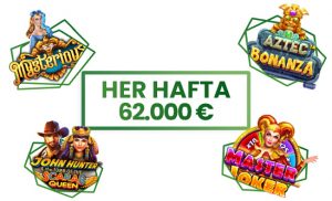 Gerek haftalık ödülü gerekse de Günlük Rastgele Ödüllerden bir veya birden çoğunu kazanabilmek için tek yapman gereken Wolf Gold, Mustang Gold, Sweet Bonanza, John Hunter Scarab Queen, Joker Jewels, Buffalo King, Dog House, Release the Kraken, Pirate Gold, Chilli Heat, Master Joker, Mysterious ve Aztec Bonanza oyunlarında en az 3.5 ₺ değerindeki bir spinle en yüksek skoru elde etmek. Minimum spin değeri olmayan ikinci haftaya özel 1.000 kat Günlük Rastgele Ödül kazanma şansı ve haftalık turnuva ödülü ile beraber 2. haftada toplamda 355.000 Euro nakit ödül seni bekliyor.